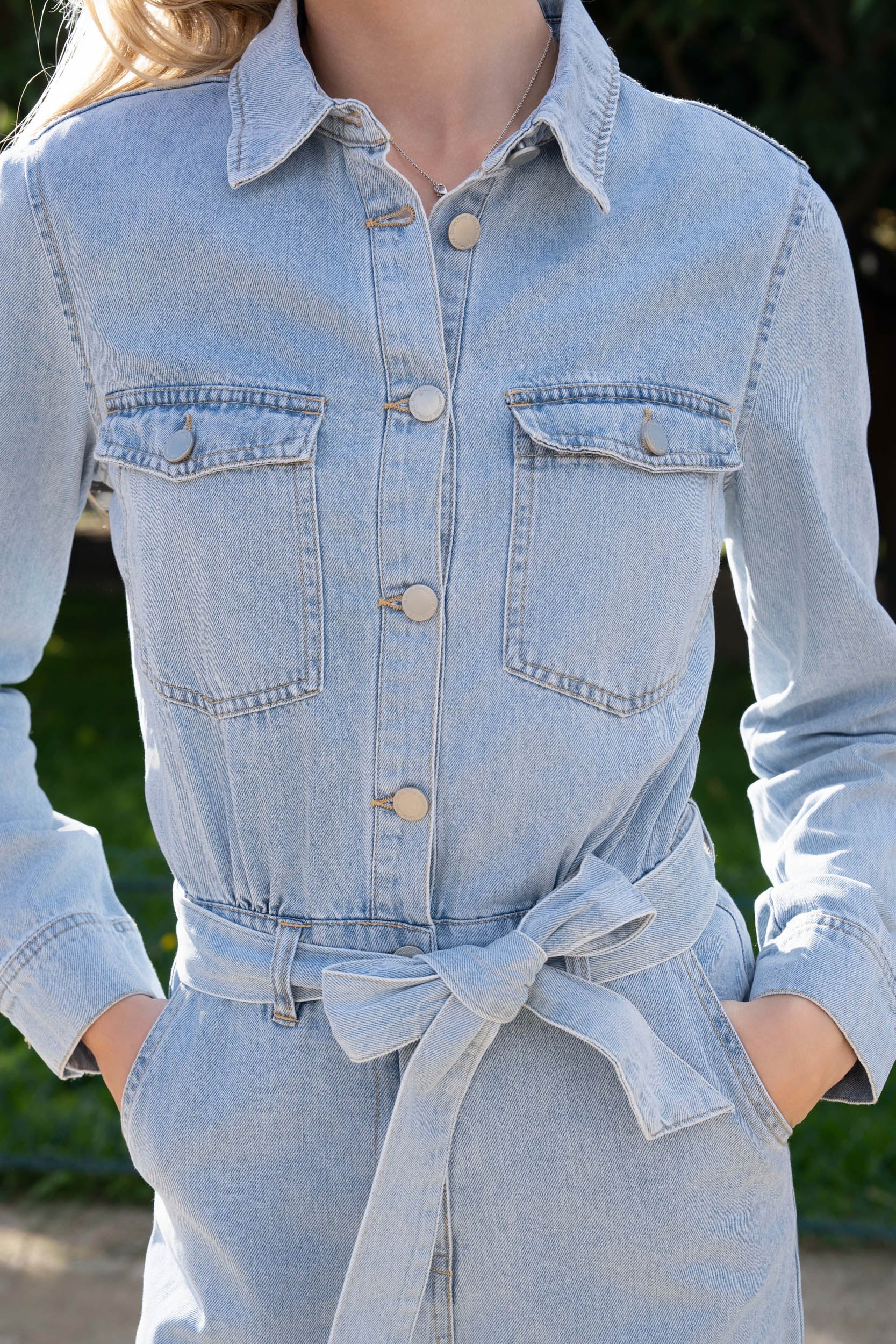 Pièce phare de la collection, cette pièce mode allie ceinture pour marquer la taille et poches pratiques. Confectionnée en coton de qualité. Une pièce à adopter d'urgence. Disponible dans ce coloris bleu jeans intemporel.