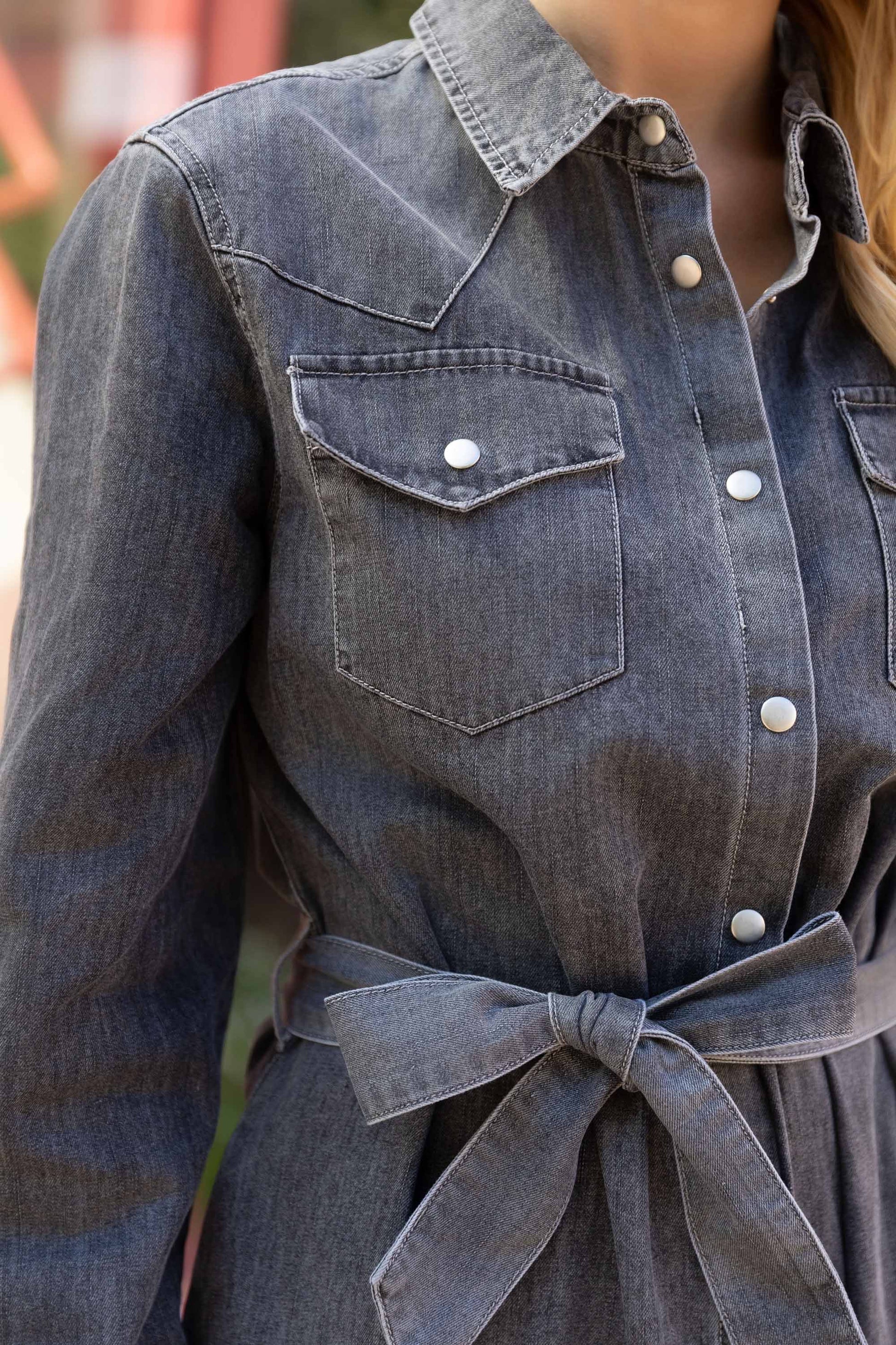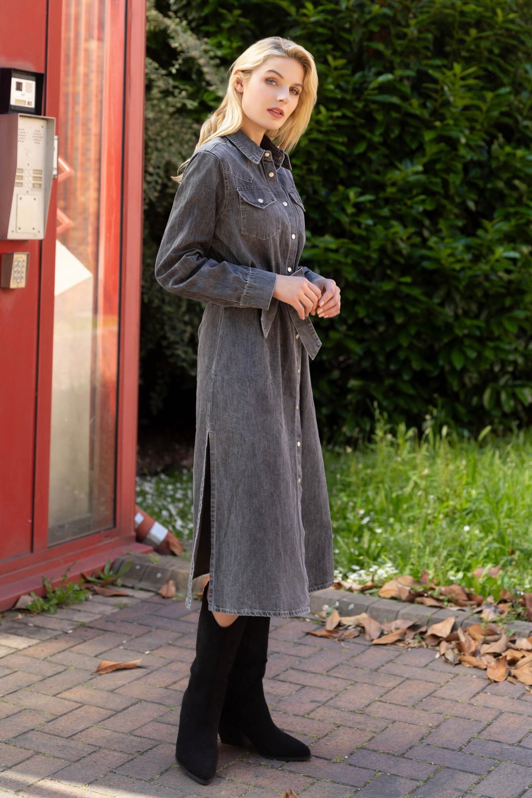 Féminité et raffinement, cette robe longue fluide allie coupe loose ultra tendance, ceinture pour marquer la taille et poches pratiques. Confectionnée en coton de qualité. Une pièce à adopter d'urgence. À décliner en gris jean, bleu jeans.